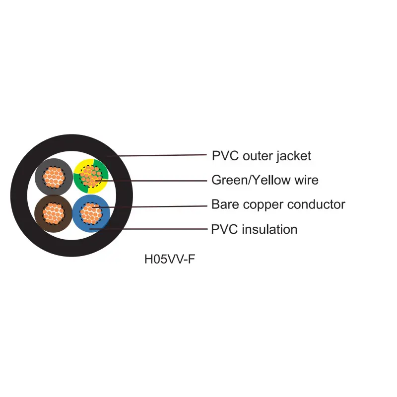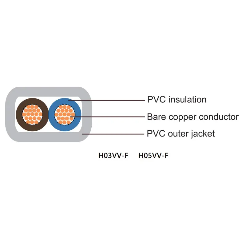 H05VV-F، H05VVH2-F، H03VV-F، H03VVH2-F از هادی های مسی خوب کلاس 5، عایق PVC بدون سرب و غلاف تشکیل شده است.